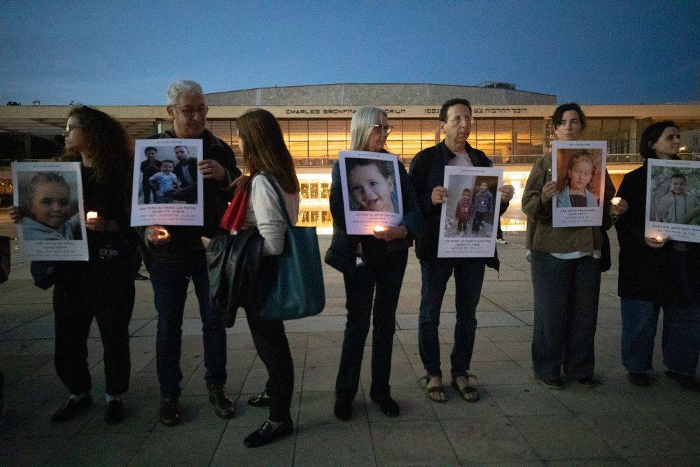 3月28日,在以色列特拉维夫,东谈主们手抓依然身一火的以色列、巴勒斯坦、黎巴嫩、伊朗儿童的相片参加抗议蚁集。(陈君清 摄)