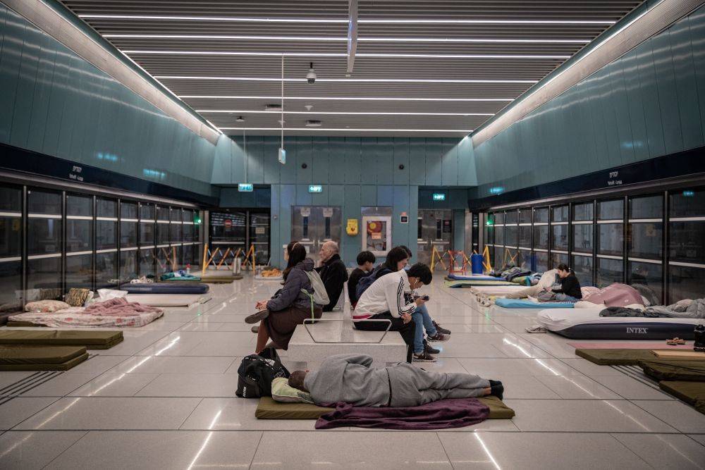 3月26日,在以色列特拉维夫,防空警报响起时,东谈主们在一处具备民防功能的地铁站逃一火。(陈君清 摄)